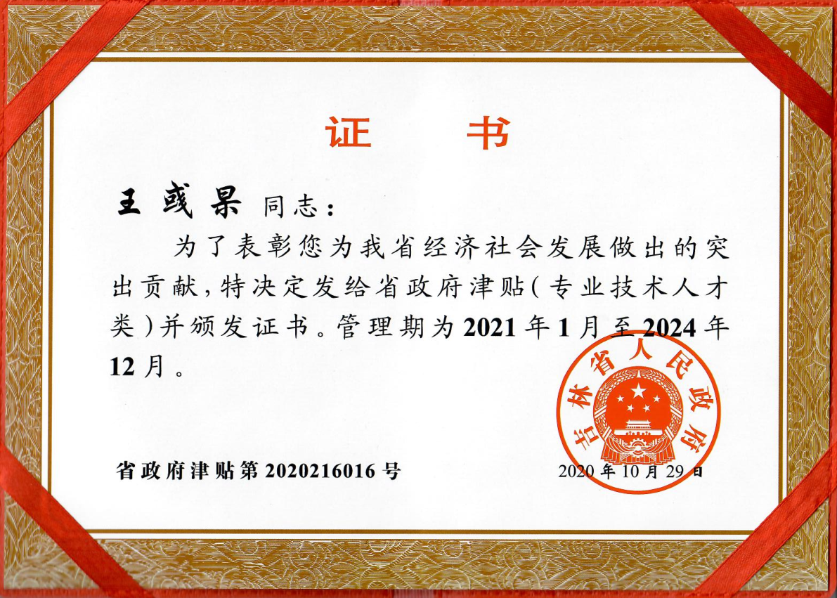 根据《关于开展吉林省第十六批享受政府津贴专家(省有突出贡献专家)选拔工作的通知》(吉人社函〔2020〕107号)文件要求,经个人申报、单位推荐、逐级审核、专家评审,选拔出367名人才作为吉林省第十六批享受政府津贴专家(省有突出贡献专家)人选,我校王彧杲同志获此殊荣!