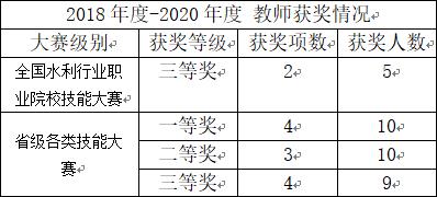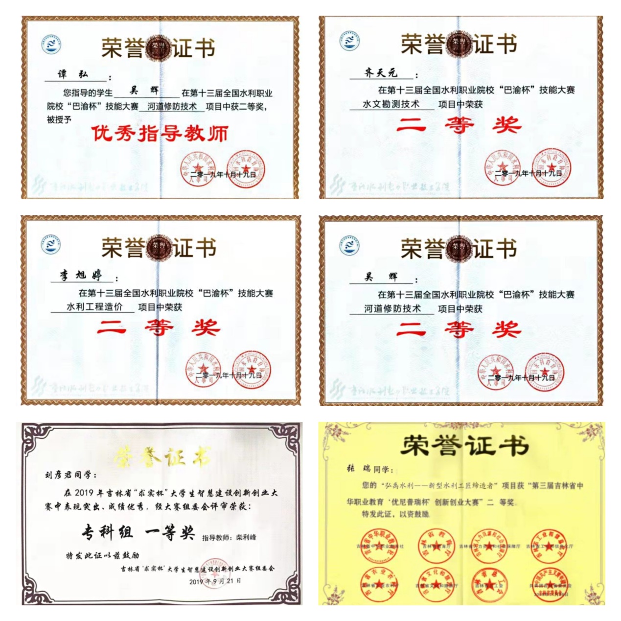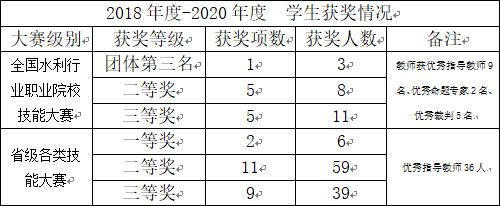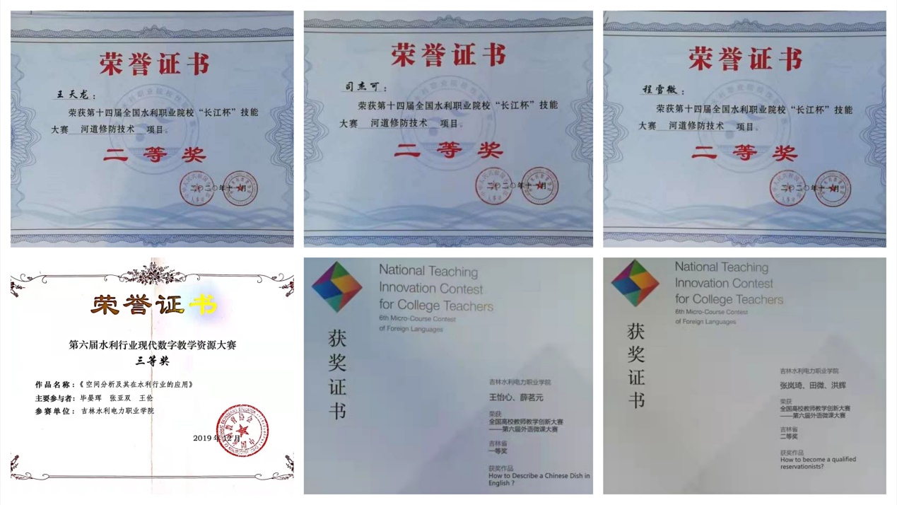 吉林水利电力职业学院在人才培养过程中,注重培养学生的专业基础知识和实践操作技能,全面提升学生的综合素质。为充分激发学生的学习兴趣和创新能力,积极组织教师、学生参加各级各类大赛。近三年来,在国赛、省赛等大赛中屡创佳绩,参加国家级比赛2项,共5人获奖;省级比赛41项,共117人获奖。