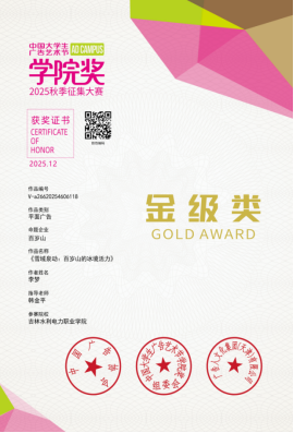 近日,在中国大学生广告艺术节学院奖 2025 秋季征集大赛中,我校数字媒体专业 2502 班学生李梦凭借原创平面设计作品《雪域泉动:百岁山的冰境活力》,在百岁山企业命题平面设计赛道中脱颖而出,一举摘得全国金级类奖项,斩获 5000 元奖金。
