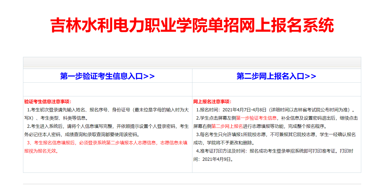 第一步:进入吉林水利电力职业学院网站(https://www.jlsy.edu.cn/),点击首页飘窗进入吉林水利电力职业学院报名系统(每名考生只允许报考一所院校)。