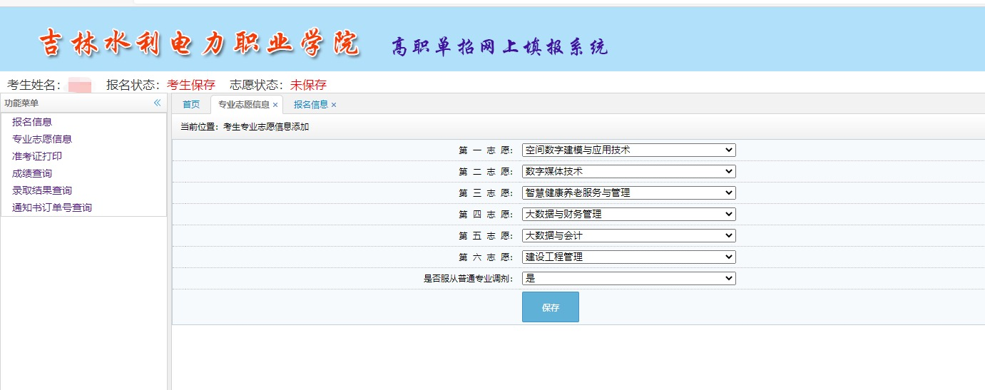 第六步:输入用户名密码(身份证后六位)进入报名系统,填报本人志愿信息点击保存,志愿信息未填报视为报名无效。(请及时修改密码,考生务必记住本人密码,成绩查询和录取查询都要使用该密码。)