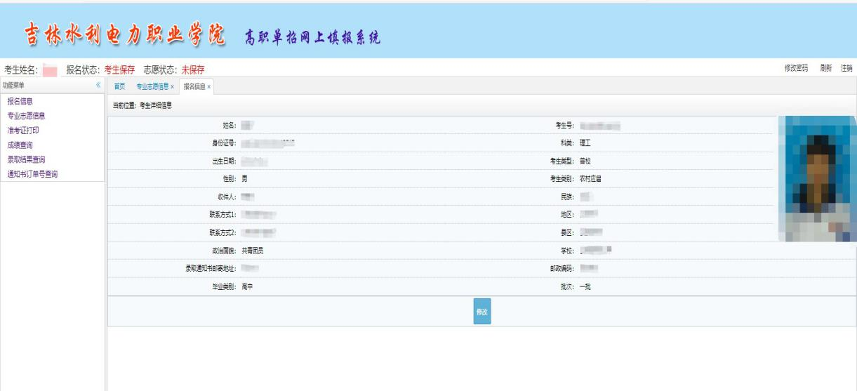 第四步:考生进入系统后,请将个人信息填写完整,点击修改保存,会弹出信息保存成功对话框,并提示二次登陆密码为身份证后六位。