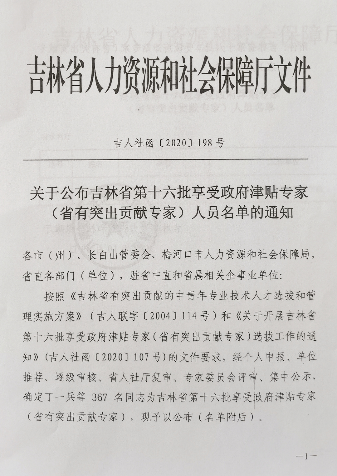 根据《关于开展吉林省第十六批享受政府津贴专家(省有突出贡献专家)选拔工作的通知》(吉人社函〔2020〕107号)文件要求,经个人申报、单位推荐、逐级审核、专家评审,选拔出367名人才作为吉林省第十六批享受政府津贴专家(省有突出贡献专家)人选,我校王彧杲同志获此殊荣!