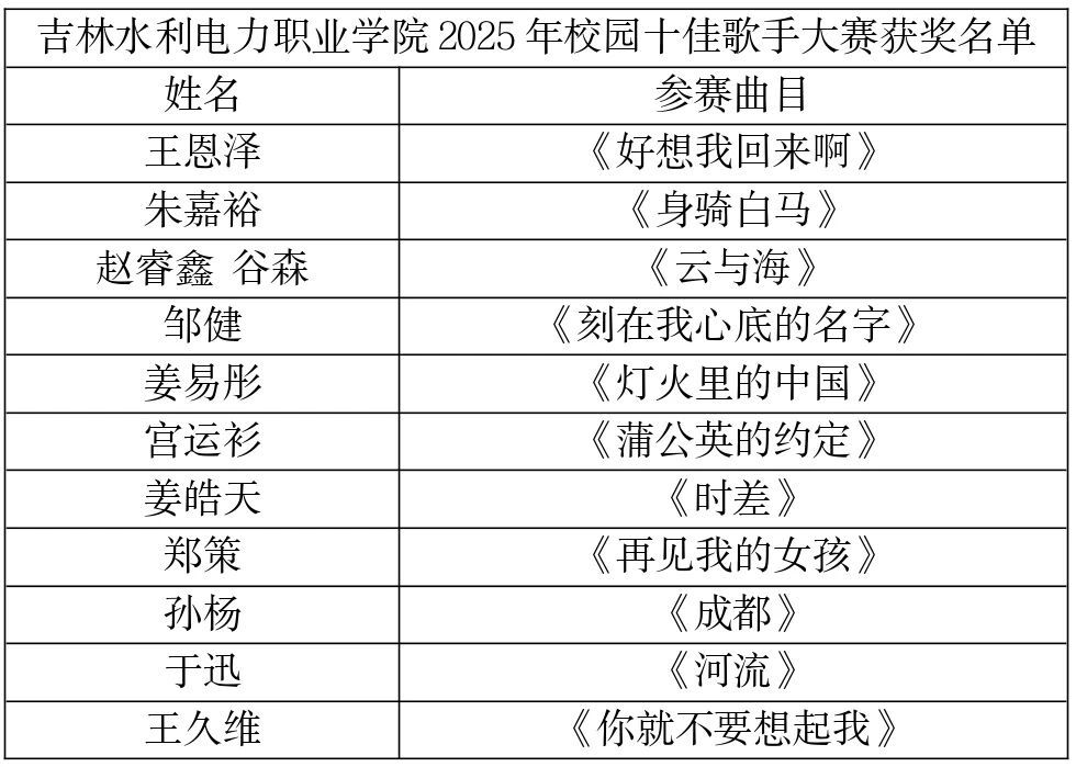 “水院好声音”十佳歌手大赛不仅是一场比赛,更是一次青春的共鸣。它丰富了校园文化生活,营造了积极向上的艺术氛围,也充分展现了吉林水利电力职业学院学子多才多艺、勇于追梦的青春风采。